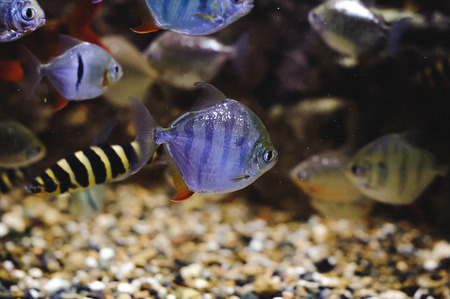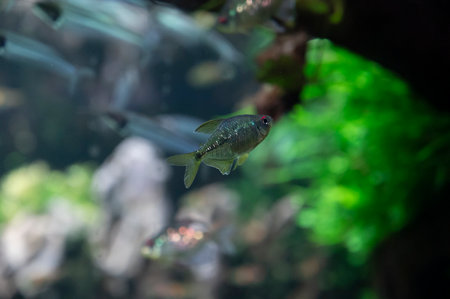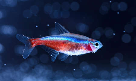 Blue Ternary genetically modified fish in the aquarium. Gymnocorymbus ternetzi. Soft focus.
