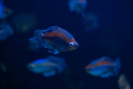 Beautiful tropical fish in an aquarium on a dark background, Thailand