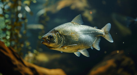 Piranha swims underwater on the bottom of the river on a background of stones.