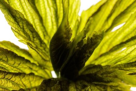 Growing leaves isolated on white background. Springtime. Macro.