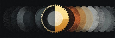 A golden cog at the center of a circular arrangement, surrounded by a gradient of metallic colors from black to bronze, creates a striking effect.