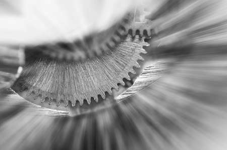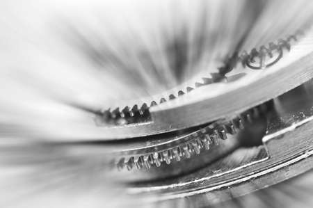 Black and white background. Metal Cogwheels in clock mechanism , abstract sun beams, Concept Movement is life, Teamwork , Idea Technology, Infinity. Macro.