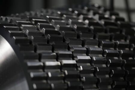 Close-up of metallic cogs nested in modern factories for rapid and transit production of different of details .Automotive manufacturing process concept