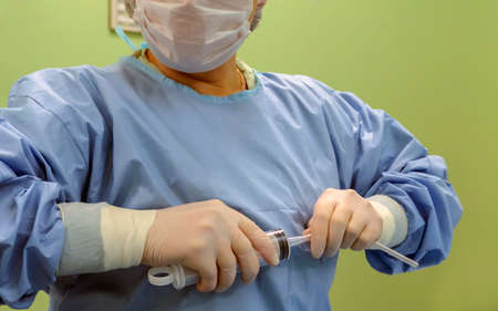 Surgeon fill syringe from medical vial for surgical procedure at sterile operation room with assistance nurse. Doctor and medical staff in full protective wear for surgery prepare anesthesia injection