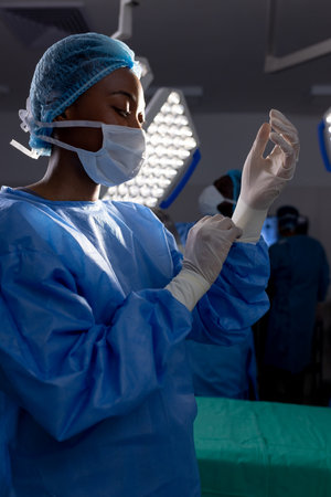 African american female doctor with face mask wearing protective gloves in hospital operating room. Medicine, healthcare and medical services, unaltered.