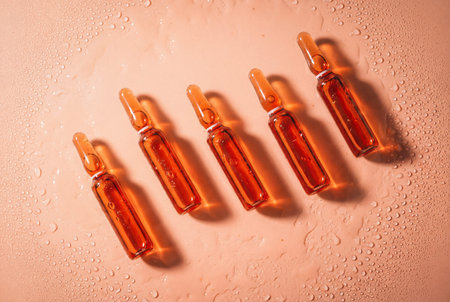 Five glass ampoules filled with orange cosmetic serum lie in a diagonal row on a peach colored surface covered with fresh water droplets and condensation.