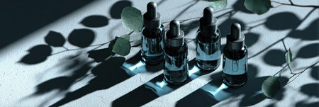 Skincare serums are displayed in a stylish formation, casting intricate shadows while green leaves add a natural touch to the serene atmosphere.