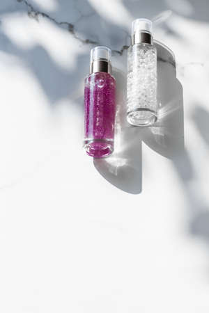 Cosmetic branding, packaging and make-up concept - Skin care serum and gel bottle, moisturizing lotion and lifting cream emulsion on marble, anti-age cosmetics for luxury beauty skincare brand design