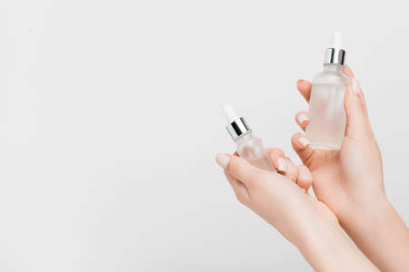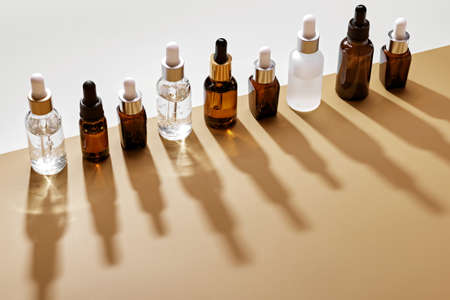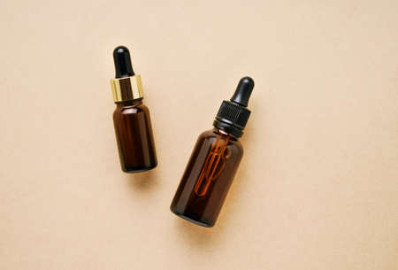 Liquid face serum in a glass bottles with a dropper. Essence of skin care for health and beauty. Copy space