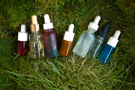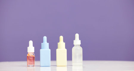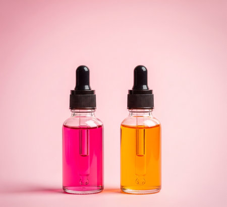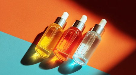 Brightly colored serum bottles arranged artistically on vibrant background Generative AI