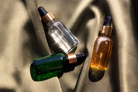 three glass cosmetic bottles with pipettes on silk fabric top view, serum, oil, serum