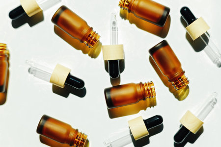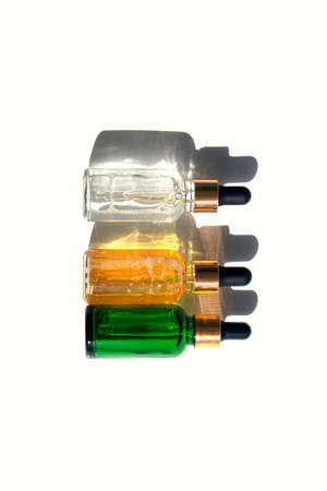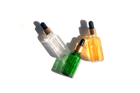 three glass bottles with pipettes with beautiful sun shadows, cosmetics of different types on a white background top view, serum, oil, serum isolate