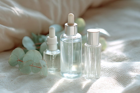 Three clear glass bottles with dropper tops, placed on a soft, light beige surface with eucalyptus leaves. The bottles contain clear liquid and are arranged for a product display or promotion. The light highlights the translucent quality of the glass bottles and the overall image is a study of minimalist design and beauty.