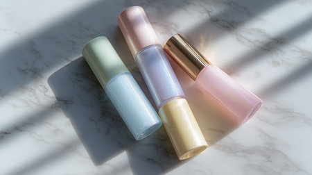 Colorful skincare bottles arranged on a marble surface in soft sunlight