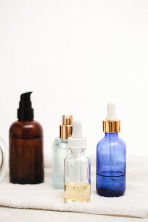 Set of colorful glass bottles with skin care products on white background with copy space. Face serums, acids and packages for essencial oils.