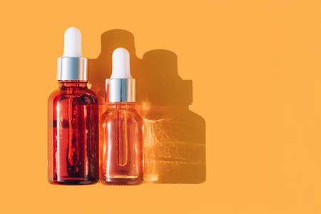 Open caps with dropper pipettes with serum. Orange background with daylight and the appearance of the texture of the liquid. Skincare products , natural cosmetic. Beauty concept for face and body care