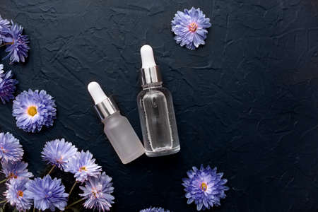 Flat lay of droppers glass bottle skincare essential oil products for mock up in minimal style with on black background with flowers