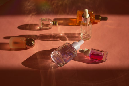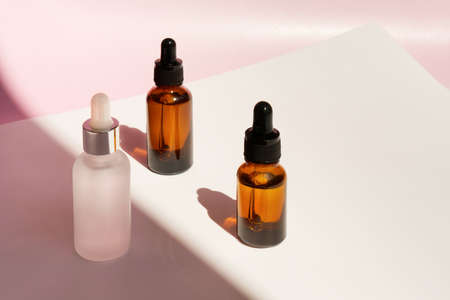 Glass cosmetic serum dropper bottles on pink surface. Nostalgic backdrop of female decorative cosmetics. Essence perfumes casting shadows. Beauty set.