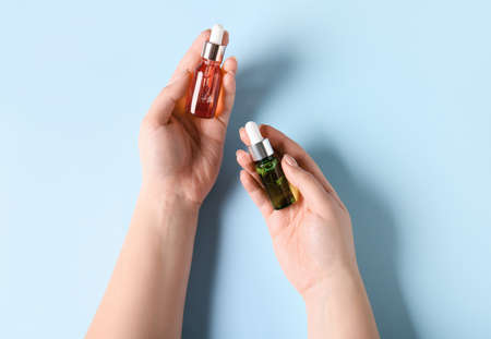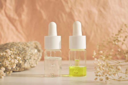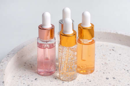 Liquid face serum in a glass bottles with a dropper. Essence of skin care for health and beauty.