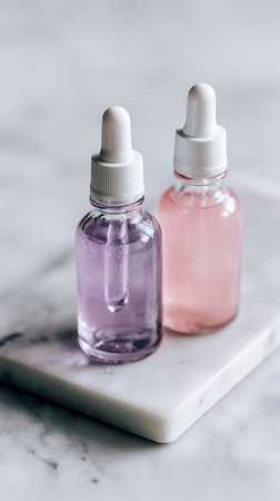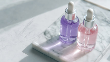Close-up displaying two sleek glass dropper bottles filled with pastel pink and purple liquids on a white marble tray, accentuated by soft sunlight and shadow play.