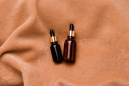Two dark brown glass dropper bottles for medical and cosmetic use on a light background. SPA concept