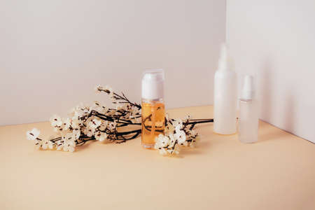 Cosmetic care products in glass bottles with orchid flowers - serums, cream, gel, oils. Concept for face and body care, wellness and spa, tropical relaxation.