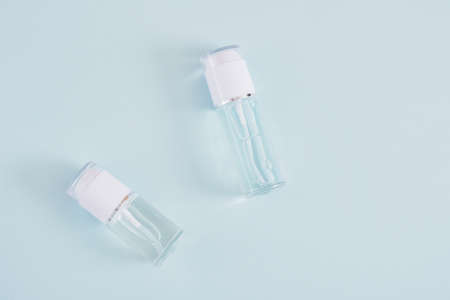 two mock up blank glass bottles with white cap on a light blue background, cosmetic bottles, bottle with gel and perfume top view copy space