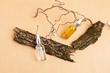 Clear and amber serums in glass bottles with wooden nature elements on sand beige background. Natural eco friendly beauty products concept