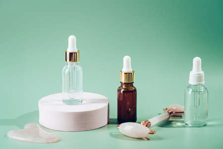 Jade face rollers and Gua sha stones for beauty facial massage therapy, Items for home treatment with Skin Care Anti-Aging Tools and Face Serum on green background