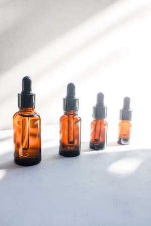 Bottles of essential cosmetic oil in a glass bottle on a white table with a natural background. Aromatherapy oil, the concept of natural cosmetics. Space for text.