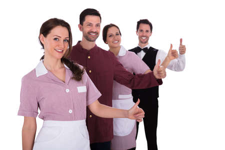 Confident Young Restaurant Staff Gesturing Thumbs Up Over White Background