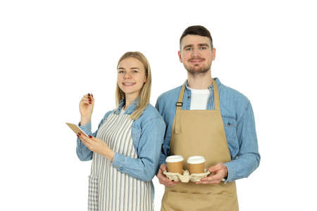 beautiful smiling waitress with a tray in her hands isolated on white background