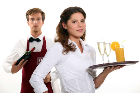 Waitress standing in hotel lobby, talking to receptionist and smiling