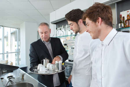 Blur background of waiter prepare coffee brake for a time after meeting or Seminar