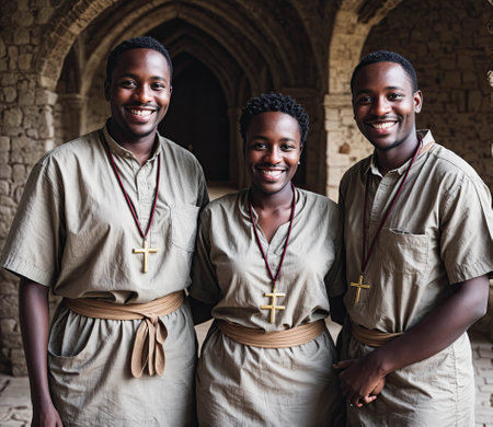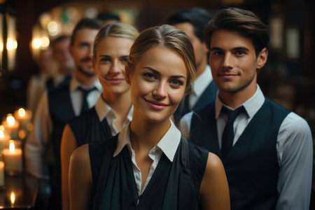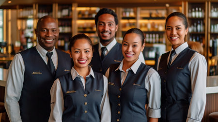 Portrait shows a group of hotel employees posing collectively in a hotel. GENERATE AI