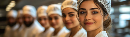 Food factory supervisor, pride in production, hygiene attire, portrait with team