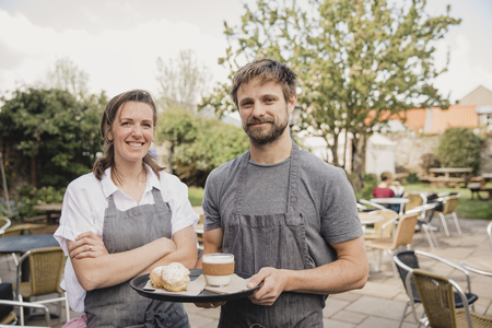 Portrait of two proud coffee shop owners standing infront of the outside seating area at their small cafe.
