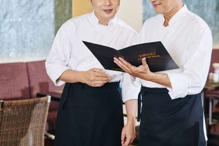 Close-up of two chefs in uniforms standing and examining the menu of restaurant in team