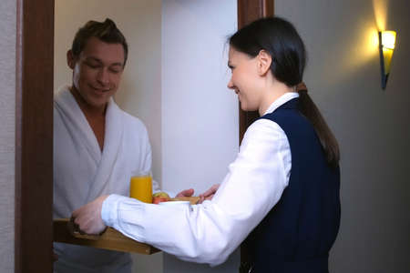 Young woman hotel worker maid in uniform is carrying a breakfast tray to the guests room. She is walking on corridor and giving a tray to man in bathrobe. The concept of room service in the hotel.