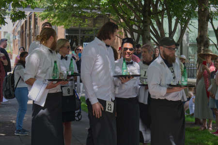 PORTLAND, OREGON/USA - JULY 13, 2019 : Competitors have a moment of relaxation before the start of the Waiters’ Race at the annual Bastille Day celebration sponsored by the Alliance Francaise de Portland
