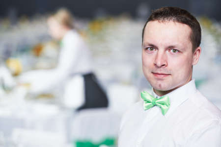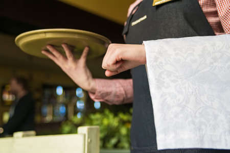 Handsome male waiter, in white shirt, holding a silver tray. The concept of serving staff serving customers in a restaurant