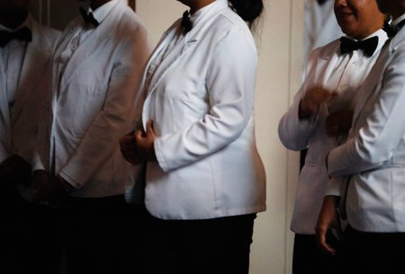 Close up of the back of a waiter wearing a white shirt and bow tie