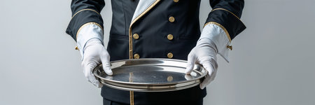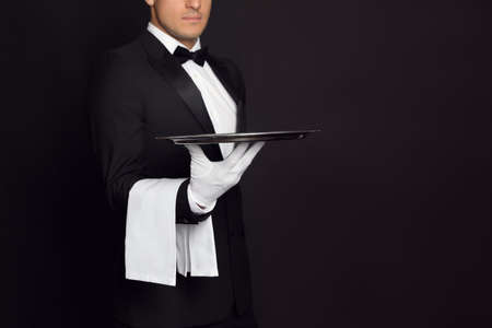 Professional waiter in formal attire holds an empty plate, ready to serve. The gray background adds a modern touch to this elegant hospitality scene.