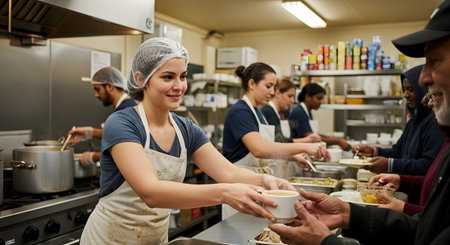 A smiling female volunteer serving a bowl of hot soup to a man in a community kitchen or shelter. This image illustrates humanitarian aid, charity work, and the spirit of giving back to society.