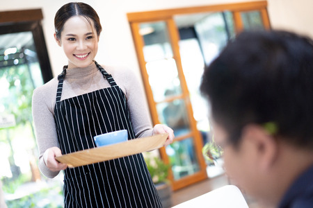 Young Asian female barista making and giving coffee to male customer. Business man receiving coffee at cafe restaurant
