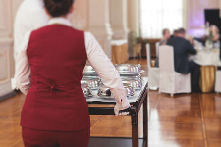 Process of serving luxury dinner in a cloche plate dish with a lid, waiter serving main course meal under silver platter on a banquet in a restaurant or hotel, serving dish food cover