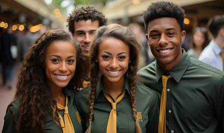 Group of office workers standing happy next to office building and showing good teamwork example.AI Generative.