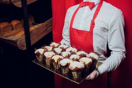 Baker keeps a tray with fresh bread man in red and white uniform baker holding a tray with bread making