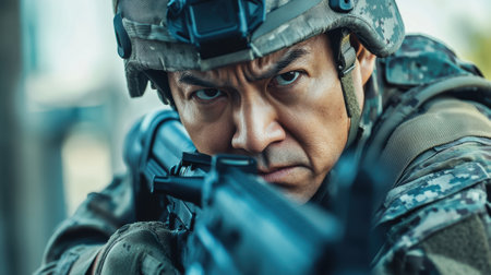 Close-up of a focused soldier aiming his rifle in an urban combat setting, ready for action and tactical operations.