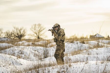 equipped army soldier Man in the winter khaki camouflage is patrolling or patrol field territory. commandos with full equipment helmet and gun watch battlefield. Modern army soldier